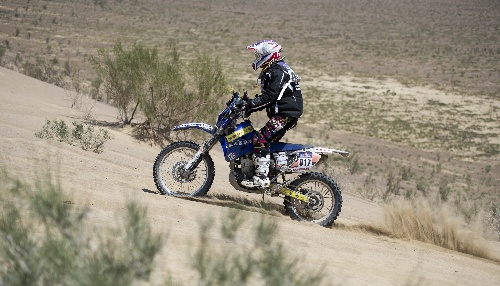 烏爾禾(新疆),2013年6月26日 賽車——新疆環(huán)塔首日賽段路況考驗(yàn)車手體力 6月26日,云南曲靖雪峰車隊(duì)摩托車車手周雪峰駕車奮力爬坡。當(dāng)日,2013年中國(guó)環(huán)塔(國(guó)際)拉力賽開(kāi)賽。全長(zhǎng)約330公里的首個(gè)賽段主要由礫石戈壁組成,坑洼較多,個(gè)別路面有急彎,而且山坡較陡,加之比賽期間溫度較高,對(duì)參賽車手的體力和耐力都是很大的考驗(yàn)。