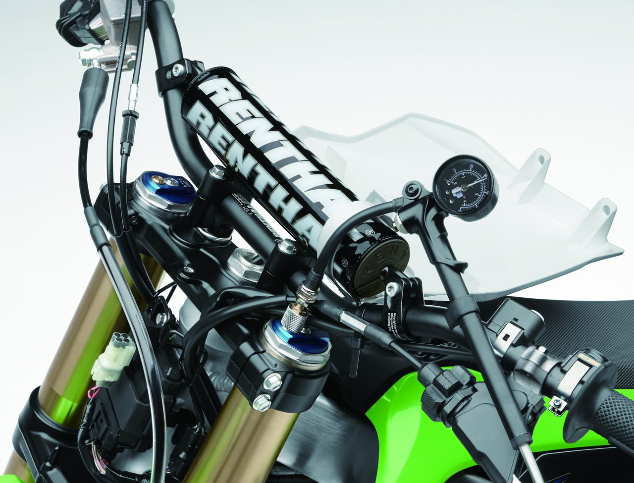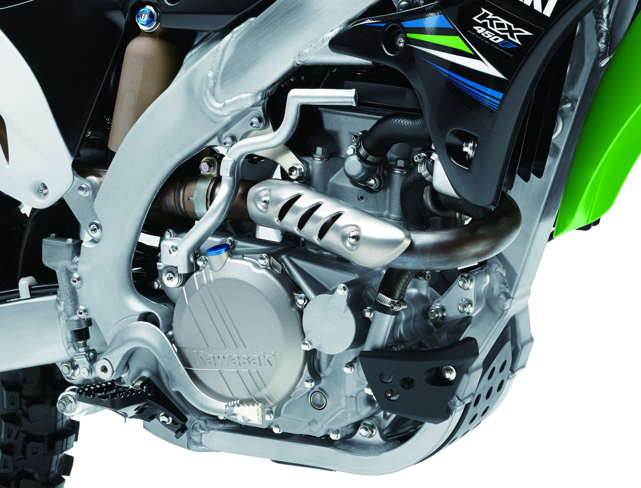 新車沿用一副水冷四沖程單汽缸、DOHC四汽閥的發(fā)動機,口徑為43mm的電子燃油噴注系統(tǒng)節(jié)流閥、五檔的變速齒輪箱。與現(xiàn)行的2013版本相比,新的變動主要是采用了廠車級的高性能活塞,換用經(jīng)過新設計的后搖臂,可作四級車把位置調節(jié)的上連板(前叉上固定板),前懸掛改用了時下流行的PSF(Pneumatic Spring Fork,氣動彈簧前叉)KYB 48mm 倒立式前叉,此外,電噴系統(tǒng)的ECU程序也經(jīng)過了改良。