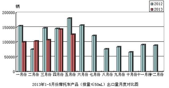 2013年5月份,摩托車產(chǎn)品(排量≤50mL)出口12.67萬(wàn)輛,比去年同期下降了30.10%;出口金額0.63億美元,與去年同期下降了29.62%。