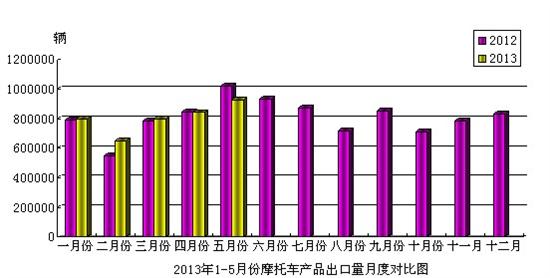 2013年5月份,摩托車產品出口92.64萬輛,比上月增長了9.99%,比去年同期下降了9.22%,出口金額4.89億美元,與去年同期下降了8.49%。