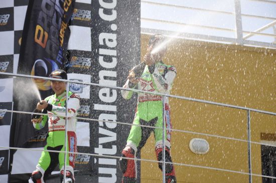 核心提示:何智鋒和蘇榮在噴灑勝利的香檳。蘇榮在奪得決賽冠軍。2013年世界杯電動摩托車公路賽西班牙瓦倫西亞站比賽,于當?shù)貢r間7月14日下