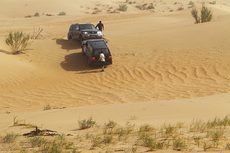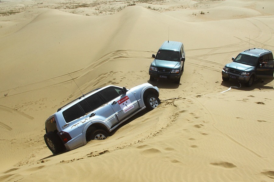 草場、大戈壁的路還相對好找,畢竟有車轍有方向可尋,但在沙漠中尋路卻并不好找,所費(fèi)的體力也就更大,每天的進(jìn)程也短。原因是沙漠的地型可變性太大,有強(qiáng)烈的起伏與落差,充滿著不可預(yù)知的危險(xiǎn)性。而且,在本次勘路中我們所使用的是民用版的三菱V73\V77及一臺負(fù)責(zé)背給養(yǎng)的LC100。雖然勘路組的成員常年往沙漠中鉆來鉆去,但為了確保安全,幾臺車在離京前都統(tǒng)一加裝上防滾架。車身重,動力弱,因此陷沙也就成了常有的事。在這次勘路期間所走過的沙漠——巴丹吉林沙漠因連續(xù)舉辦幾年的比賽,大家走起來還尚算順利,但在騰格里沙漠中,則困難重重。勘路中的一名年輕小伙就因暈車,一邊挖沙子,一邊吐,一鏟沙子一口胃液,苦不堪言。