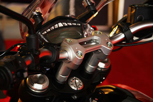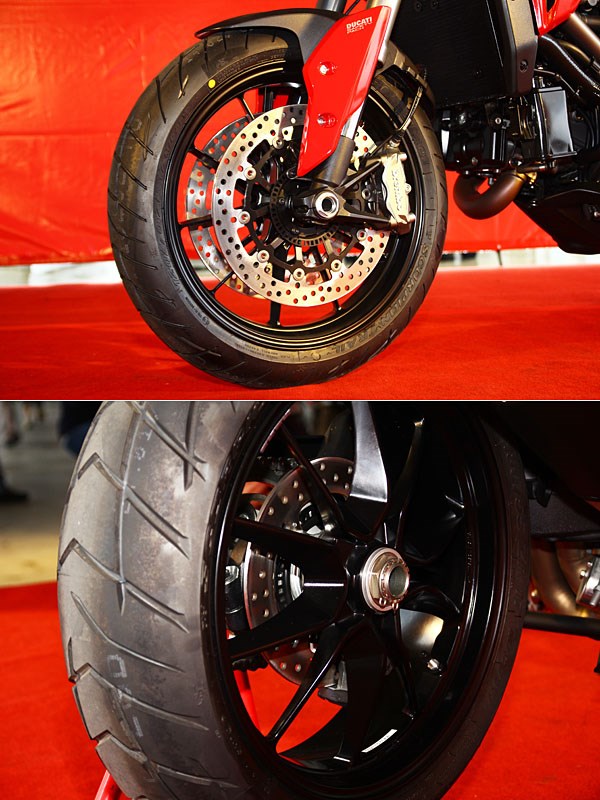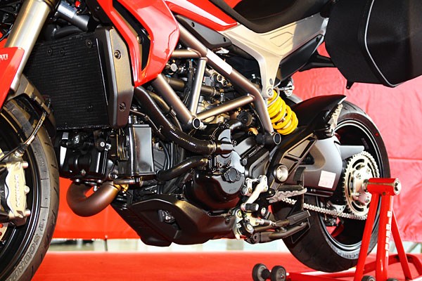 身為發(fā)表會主角的全新車系Hyperstrada,車體上與全新Hypermotard相同將原有鋼管車體結(jié)構(gòu),設(shè)計成前鋼管結(jié)構(gòu)結(jié)合后鋁合金車體的設(shè)計,期望能有效減輕車體重量,車重也因此壓至181kg水準(zhǔn)。為了提供更適合長途騎乘的騎姿,把手高度提高了2cm,而引進(jìn)的亞洲版車型座高則為810mm,后座也加裝乘客安全扶手。