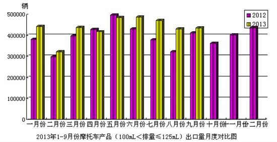 2013年9月份,摩托車產(chǎn)品(100mL<排量≤125mL)出口43.51萬輛,比去年同期增長(zhǎng)了5.67%;出口金額2.25億美元,與去年同期增長(zhǎng)了5.43%。