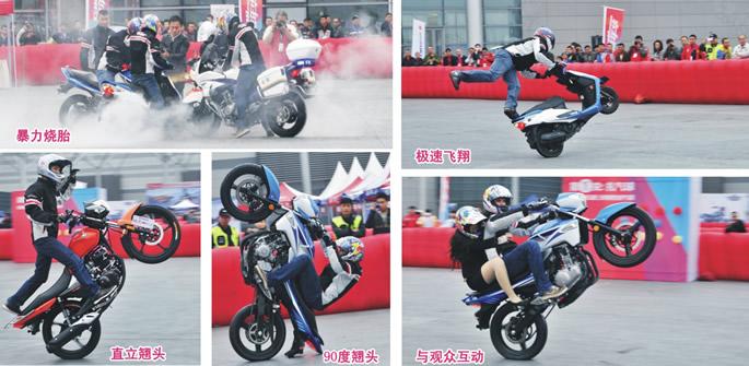 在摩托車展館室外的北廣場,音樂聲、馬達聲、吶喊聲、掌聲此起彼伏。豪爵摩托特技表演現(xiàn)場,來自BG車隊的澳大利亞車手Sammo、美國車車手Eric、中國車手韓峰和阿里木,騎著不同款式的豪爵摩托縱橫馳騁,為觀眾們帶來了一場又一場視覺盛宴。