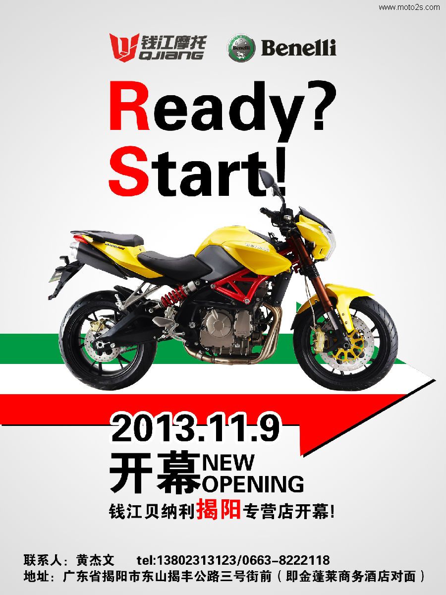 經(jīng)過一個月的緊張裝修籌備、錢江貝納利廣東揭陽專營店將于明天2013年11月9日盛大開業(yè)。這是錢江摩托重啟廣東市場取得的階段性成果,標志著揭陽市場錢江貝納利發(fā)展取得新的突破和發(fā)展機遇。