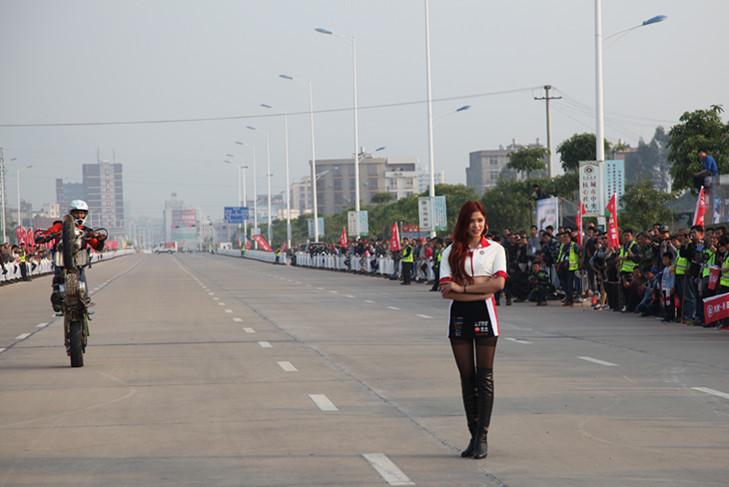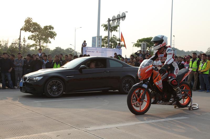 下午,五羊-本田CRRC賽車與寶馬M3改裝車在400米直道上演了一場刺激的PK賽,幻影GP略占上風(fēng)。特技車手也使出看家本領(lǐng),為大家獻(xiàn)上精彩的摩托特技秀。