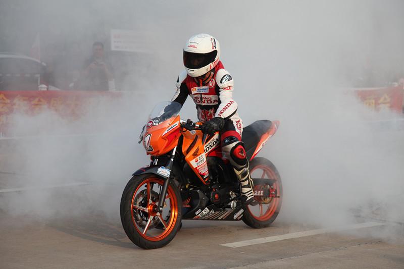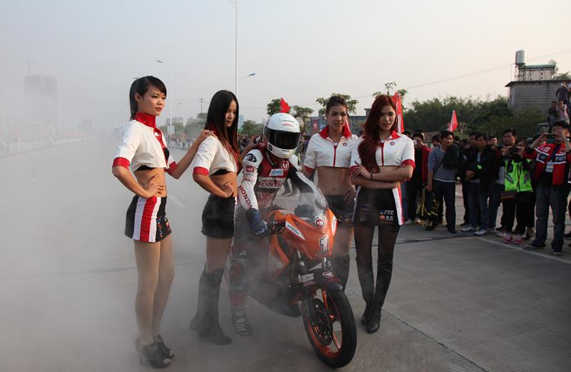 車手陳遠(yuǎn)航在現(xiàn)場玩燒胎