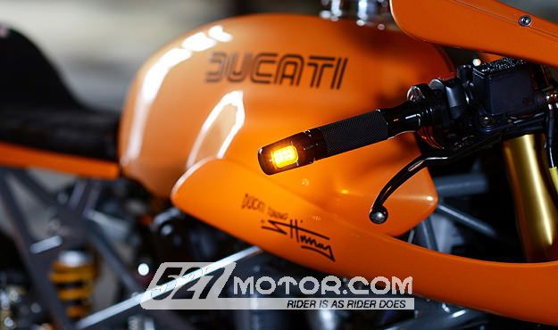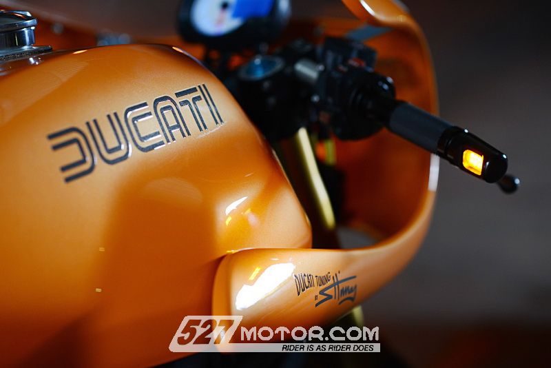 這輛Ducati Monster 900,為了達(dá)到傳統(tǒng)咖啡特色的水平式車架,重新修改了赴車架,然后換上了Sportclassic車系的油箱,搭配手工制作的一體式座墊與駝峰。半罩式豬頭沿用了Ducati經(jīng)典的Imola造型(這個豬頭罩也出現(xiàn)在sportclassic 1000S車型上)但油箱蓋則被改成更經(jīng)典的英國Norton風(fēng)格外蓋。不過改裝廠很巧妙移植了Ducati 999車型上的經(jīng)典直立式雙燈!讓整體看起來別具特色。