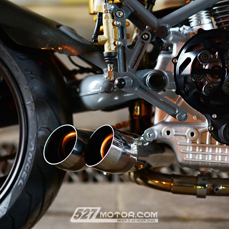 后搖臂則是換上讓所有喜歡老Ducati都留口水的單搖臂結(jié)構(gòu),該套件流用自S2R,前后輪圈也是S2R的套件。前后減震也是換上Ducati自家916 SP的Ohlins部品。配胎的搭配也是很意大利!采用的是Pirelli Angel ST跑胎。