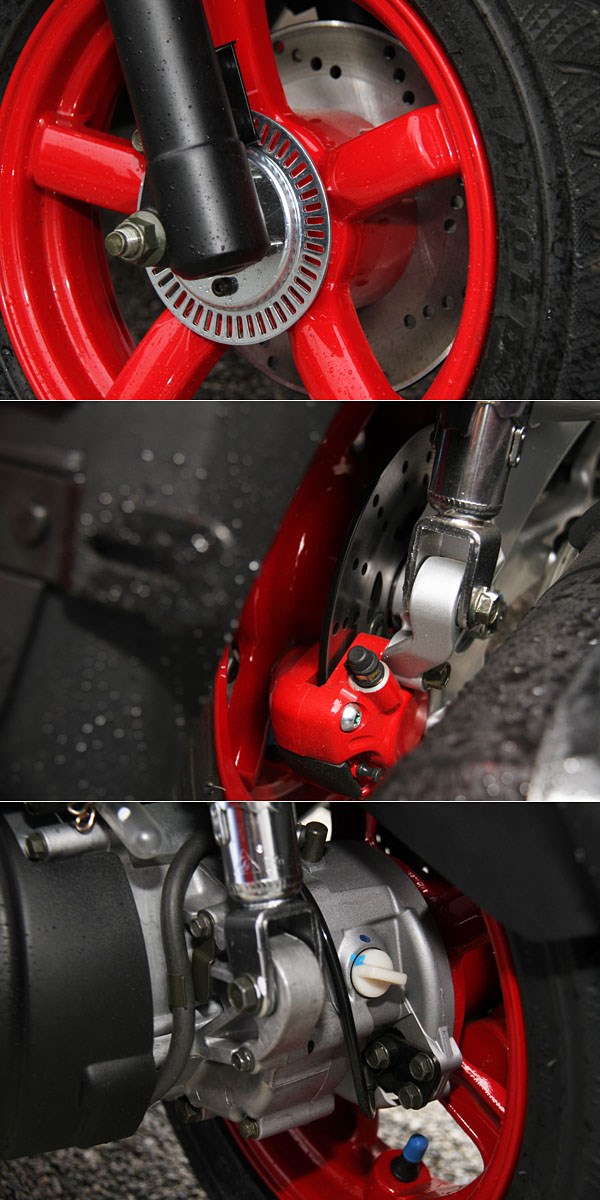 安全系統(tǒng)的設(shè)定上,J-BuBu 115配備前后大尺寸碟盤,搭配金屬油管,加上Bosch ABS的精準(zhǔn)控制;而在后輪的轉(zhuǎn)速感側(cè)盤隱藏於輪轂內(nèi),不如前軸外露。
