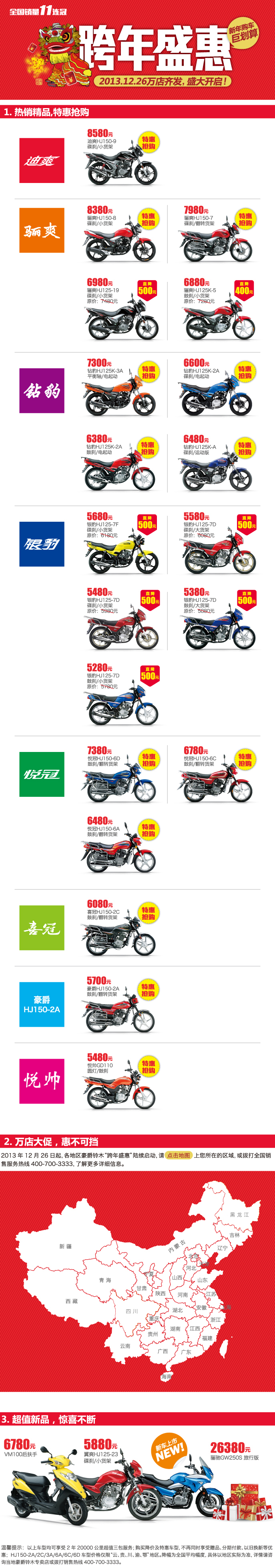 2013年12月26日,豪爵鈴木11連冠“跨年盛惠”盛大開啟,全國1萬多家豪爵鈴木店將陸續(xù)推出超級給力的購車優(yōu)惠:熱銷精品,特惠搶購;超值新品,驚喜不斷;萬店大促,惠不可擋。請情敬請登陸豪爵官網(wǎng)www.haojue.com,或撥打全國銷售服務(wù)熱線400-700-3333,獲取詳細的促銷信息。這個新年,讓我們盡情狂歡!
