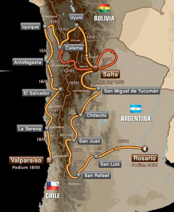1月13日(第8賽段)汽車/卡車組再從薩爾塔出發(fā),一路向西北挺進(jìn)智利境內(nèi),終點(diǎn)為卡拉馬(Calama),與此同時摩托車/四輪摩托車組將離開烏尤尼,向西南方向趕路,最終在卡拉馬與大部隊回合。