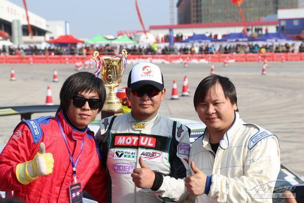 首輪汽車漂移挑戰(zhàn)賽冠軍王昌璽(中)、亞軍熊永佳(右)、季軍夏侯煒炫(左)合影