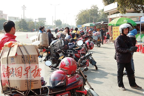 梧州是廣西的“東大門”,也是摩托車大軍從廣東回來后進(jìn)入廣西的第一站。據(jù)梧州市交警支隊(duì)介紹,2014年春運(yùn)相對(duì)較早,加上天氣暖和,從1月10日左右就開始出現(xiàn)摩托車返鄉(xiāng)隊(duì)伍,2014年春運(yùn)首日過境返鄉(xiāng)摩托比往年較多,達(dá)到6000多輛。據(jù)了解,今年春運(yùn)期間,摩托車返鄉(xiāng)大軍在梧州東出口過境的高峰預(yù)計(jì)出現(xiàn)在1月24日至29日,屆時(shí)預(yù)計(jì)日均車流量在2~3萬輛之間,整個(gè)春運(yùn)期間預(yù)計(jì)有40萬輛次的摩托車經(jīng)過梧州境內(nèi)。