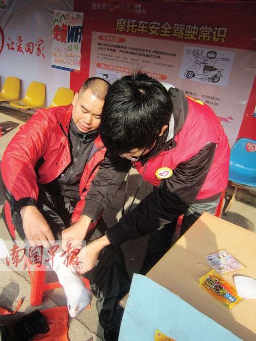 廣東肇慶市的一個(gè)服務(wù)站內(nèi),志愿者為返鄉(xiāng)農(nóng)民工貼上暖腳帖。