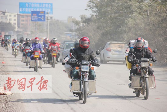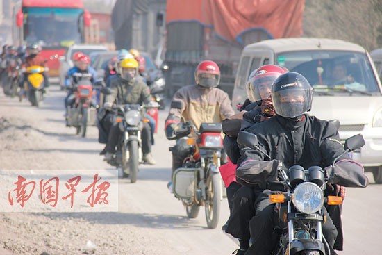 核心提示:1月19日下午,梧州藤縣,摩托大軍行駛在滿是灰塵的國道上。摩托大軍行駛在梧州藤縣的國道上。本報(bào)記者(右)在體驗(yàn)途中與返鄉(xiāng)農(nóng)