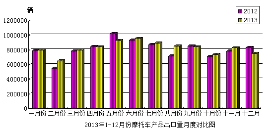 2013年12月份,摩托車產(chǎn)品出口75.00萬輛,比上月下降了9.56%,比去年同期下降了10.04%,出口金額4.04億美元,與去年同期下降了8.33%。