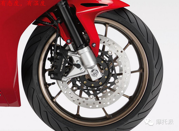 新款VFR800F配備有徑向式三活塞制動卡鉗,搭載了一對直徑310mm浮動碟盤,舍棄了之前本田常用的CBS聯(lián)動剎車系統(tǒng),并在變準版上增加了ABS。頭尾燈都是LED規(guī)格。