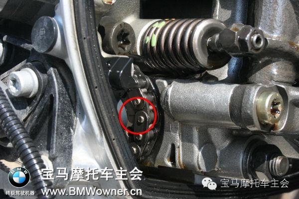 把車子掛上6檔,用手轉(zhuǎn)動(dòng)后輪使右汽缸到達(dá)上止點(diǎn)。怎么判斷到達(dá)上止點(diǎn)了呢?留意上圖紅圈位置,鏈輪上有個(gè)小箭頭,正好朝外跟火花塞位置相同了,這就是了。如果這時(shí)候進(jìn)氣門和排氣門沒有同時(shí)被搖臂釋放,那就繼續(xù)旋轉(zhuǎn)后輪,同時(shí)觀察鏈輪上的上止點(diǎn)箭頭,直到箭頭在一次到達(dá)剛才提及的位置。這個(gè)時(shí)候氣門就應(yīng)該被釋放了。