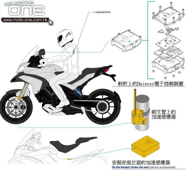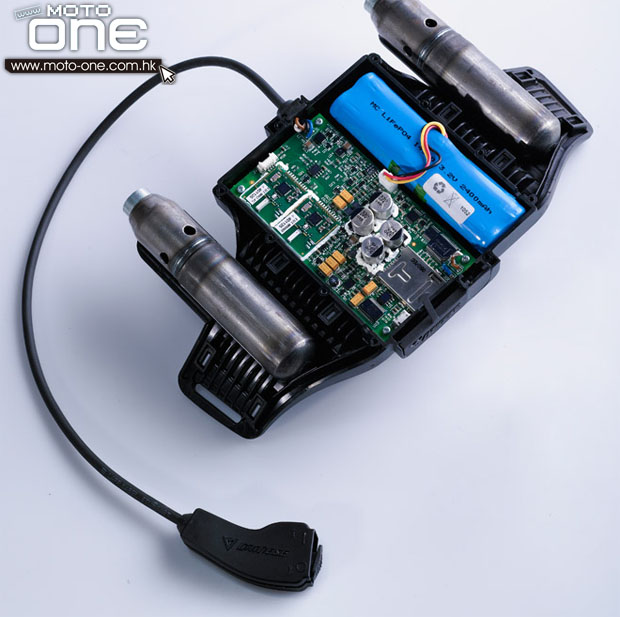 由于賽道與街道駛駕環(huán)境截然不同,甚至出現(xiàn)撞墻、撞樹或與其他車輛發(fā)生碰撞, 因此街道版的D-air系統(tǒng)更復(fù)雜。衣服內(nèi)氣囊除了有更廣泛保護范圍外,并且需要在前叉管及座椅下裝置加速感應(yīng)器(Accelerometers),還需 要在轪把上加裝電子裝置,目的與衣服內(nèi)D-air進行無線連接,提升更準確氣囊膨脹的時間。