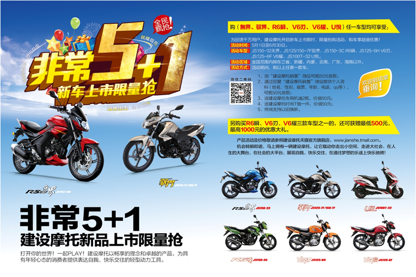 為回饋千萬用戶,建設(shè)摩托開啟新車上市限時、限量搶購活動,購車享超值優(yōu)惠!
