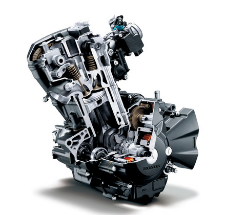 引擎缸徑與行程為76mmx55mm,是與CBR1000RR同樣的短行程高轉數(shù)引擎(CBR1000RR缸徑行程為76mmx55.1mm),令引擎轉數(shù)比前一代提高500rpm,并增加了1kW的馬力輸出。在動力提升的同時,也保有良好的燃油經(jīng)濟性,實驗測試每公升可行駛50.1km。為了進一步營造性能車款輕快的拉轉性能,修改空濾與進氣岐管的設計,并搭配新設計的排氣管,讓CBR250R引擎反應比前一代更快速。
