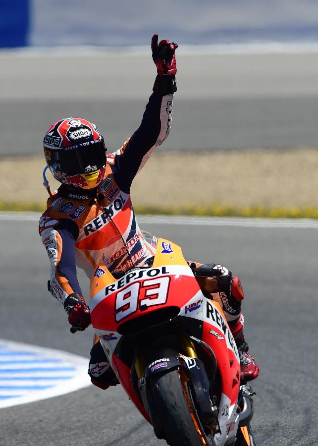 5月4日,本田車隊的西班牙車手馬克·馬克斯(中)、雅馬哈車隊的意大利車手羅西(左)和本田車隊的西班牙車手佩德羅薩在頒獎儀式上慶祝。當(dāng)日,在西班牙摩托車大獎賽MotoGP級比賽中,馬克·馬克斯以45分24秒134的成績奪得冠軍;羅西和佩德羅薩分獲亞、季軍。