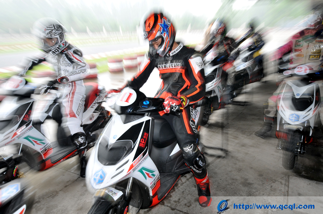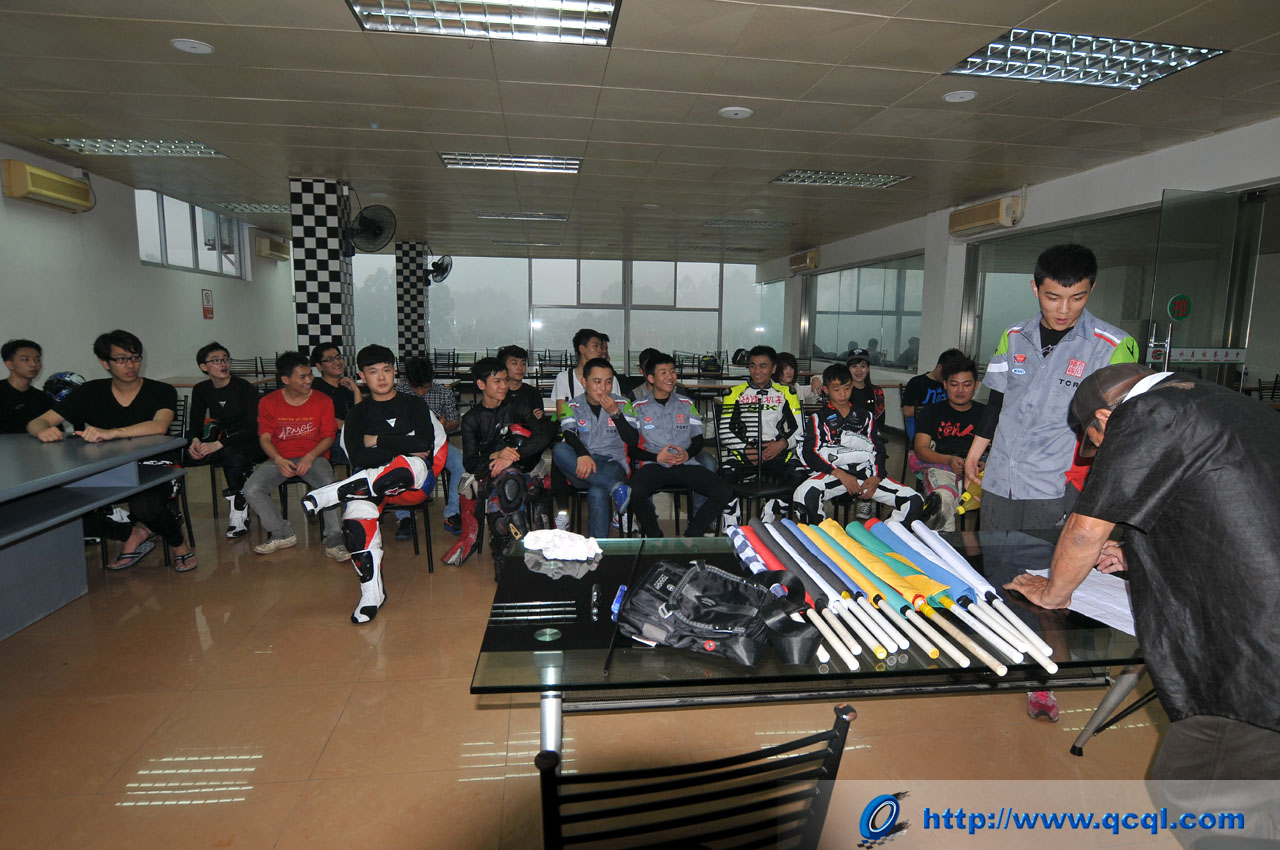 下午比亞喬單車型組別培訓(xùn)班也進(jìn)行理論和賽道培訓(xùn),進(jìn)過大概半小時(shí)的理論培訓(xùn)后,就下賽道分批進(jìn)行賽道培訓(xùn)。由于當(dāng)時(shí)已經(jīng)下起陣雨,賽道相當(dāng)濕滑,車手們基本都是新人,賽車的熱情掩蓋對(duì)路面的判斷,多位新手相繼滑出賽道,幸好并沒大礙。本安排培訓(xùn)后還有時(shí)間給其他車手進(jìn)行賽道練習(xí),但雨勢(shì)越下越大。賽道已經(jīng)形成積水,賽會(huì)經(jīng)判斷后決定無法再進(jìn)行練習(xí)。今天備戰(zhàn)氣氛不算緊張,工作人員和車隊(duì)有條不絮地進(jìn)行比賽前相關(guān)工作。