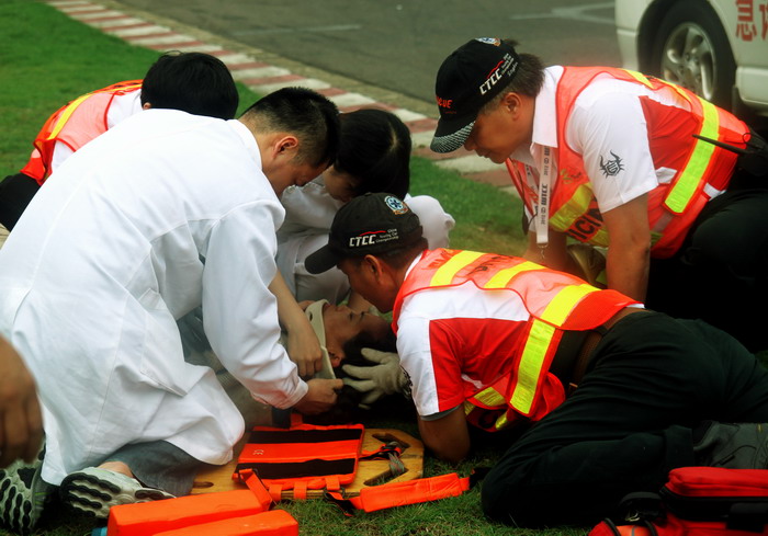 今日的三水,天公不作美,時(shí)有時(shí)無(wú)的雨水讓車手們的準(zhǔn)備工作不斷調(diào)整,是用雨胎還是干胎比賽幾乎成為每個(gè)車隊(duì)和都在糾結(jié)的問(wèn)題。在進(jìn)行計(jì)時(shí)排位賽時(shí)天空烏云密布,但雨水一直隱忍未發(fā)。到了第一回合正式比賽時(shí),淅淅瀝瀝的小雨終于落下,雖然雨勢(shì)不大,卻給比賽場(chǎng)地造成了不小的影響??紤]到場(chǎng)地濕滑,為了安全起見(jiàn),主辦方最終決定減少比賽圈數(shù)。
