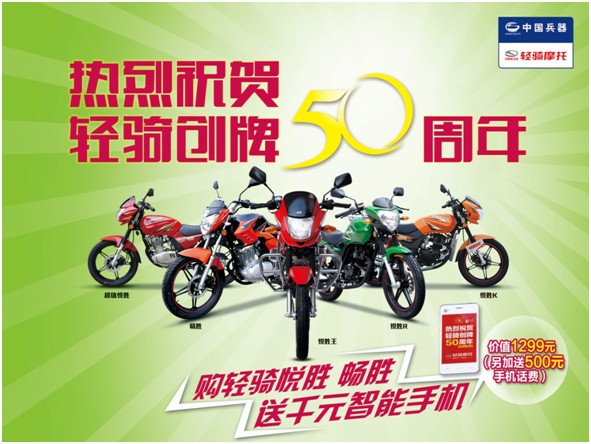 時值輕騎創(chuàng)牌50周年慶,為了回饋廣大消費者對輕騎品牌長期以來的支持與信任,濟南輕騎2014年5月1日——2014年6月25日,在全國范圍內(nèi)舉行“矩惠無限 天賜良‘機’購輕騎悅勝、暢勝送千元智能手機活動”,凡購買輕騎GS系列產(chǎn)品——輕騎超值版悅勝、悅勝K、悅勝王、暢勝中的任意一款車,均可獲贈價值1299元的名牌時尚智能手機一部,另外加送500元手機話費。機不可失,趕快行動吧。