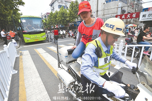 昨天中午,結(jié)束首場(chǎng)考試的開發(fā)區(qū)中學(xué)考生趙婷婷坐上了市交警支隊(duì)一大隊(duì)民警朱榮信駕駛的警用