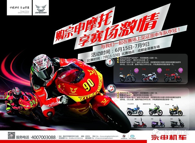 宗申車隊(duì)-中國(guó)國(guó)家摩托車隊(duì),2014年將參加全國(guó)公路摩托車錦標(biāo)賽共五站賽事,7月11日-13日將參加第三站——“成都金港賽車場(chǎng)”比賽。為此,宗申公司將在2014年6月15日——7月9日開展以下活動(dòng):