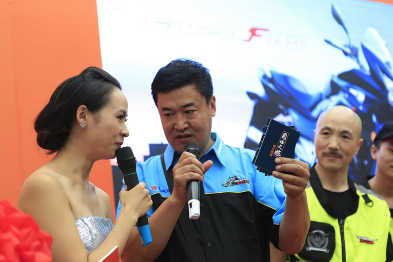 豪爵商務(wù)有限公司總經(jīng)理陳義新上臺(tái)致辭。 先是介紹了GW250F的各項(xiàng)特點(diǎn):“GW250F采用全新設(shè)計(jì)的超大導(dǎo)流罩、經(jīng)UV光固化處理的防彈玻璃風(fēng)擋, 并通過對(duì)手把高度和寬度的調(diào)整,使駕駛姿勢(shì)從直立變?yōu)榍皟A,更適合高速行駛。同時(shí),新設(shè)計(jì)了前減振防護(hù)罩,可避免飛濺的砂石等硬物對(duì)前叉管運(yùn)動(dòng)部位的碰傷,尤其適合100km/h以上的高速巡航。”