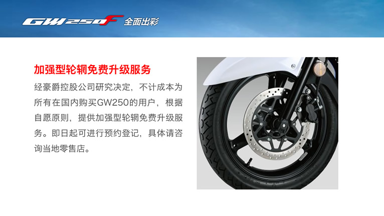 GW250F還配備了專為中國市場(chǎng)開發(fā)的加強(qiáng)型輪輞,其側(cè)向抗沖擊能力提升了一倍。 在大家都以為即將要公布價(jià)格的時(shí)刻,陳總宣布了一個(gè)爆炸性信息:“為所有在國內(nèi)購買GW250的用戶,根據(jù)自愿原則,提供加強(qiáng)型輪輞免費(fèi)升級(jí)服務(wù)。身處全球GW250的生產(chǎn)基地,中國用戶配得上這樣的禮遇。”