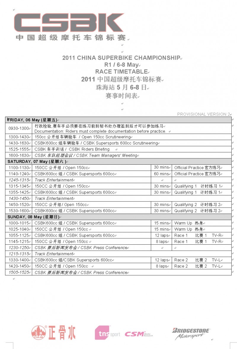 核心提示:2011年中國超級摩托車錦標(biāo)賽(CSBK)珠海站-賽事時間表