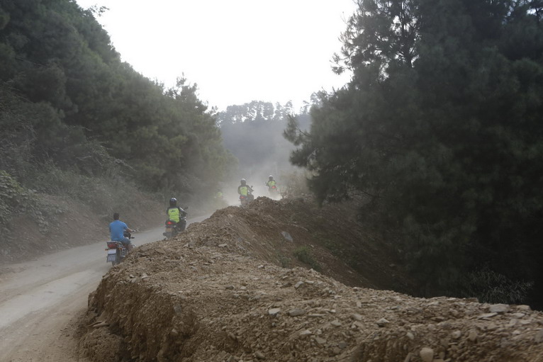 轎車還能往高速上跑,摩托車受限于法規(guī),必須硬上,揚(yáng)塵、坑洼、泥土,讓來自上海及周邊的車友痛苦不堪,只跑了一小段,隊(duì)員們渾身上下都是塵土。