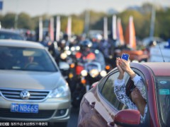 一位市民從車?yán)锷斐鍪謾C(jī)來拍攝萬圣節(jié)哈雷巡游車隊(duì)。