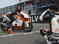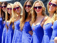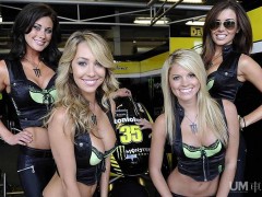 職業(yè)摩托車比賽開始前,車手身邊的姑娘們都有一個統(tǒng)一的名稱,Paddock Girls(或Umbrella Girls)。她們的作用有兩個,一是給車手遮陽,在等候發(fā)車的時間里,車手身著賽服在引擎烘烤的賽道上本就酷熱難耐,為了防止他們進一步疲勞,廠商會雇傭姑娘們?yōu)樗麄冏钃跆栔鄙?;二自然就是廠商宣傳的活廣告板,身材曼妙衣著性感,吸引眼球就是她們的目的,自然也形成了一道風(fēng)景線。