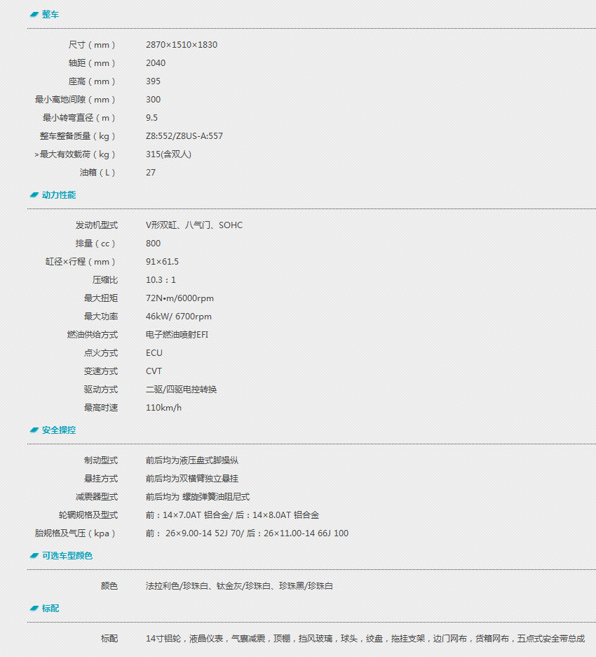 ZFORCE 800EX(簡(jiǎn)稱Z8-EX),堪稱國內(nèi)最強(qiáng)大的全地形越野車,擁有行業(yè)頂級(jí)配備,集強(qiáng)勁的動(dòng)力、富有駕駛樂趣的操控以及優(yōu)良的人機(jī)工程學(xué)設(shè)計(jì)于一身,無論惡劣地形還是復(fù)雜路況,均能輕松勝任,帶給駕駛者難忘而又富于激情的完美駕駛體驗(yàn)。