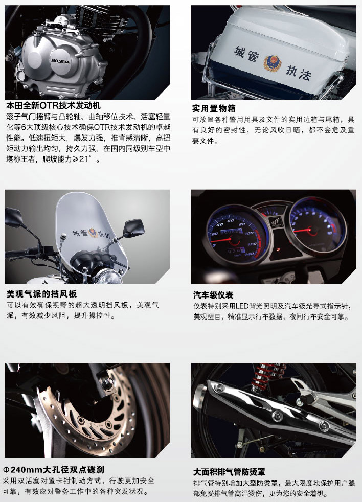 威武之師系出名門WH125-11公務(wù)車,125cc鋒翼多用途公務(wù)車,本田全新OTR技術(shù)發(fā)動機,滾子氣門搖臂與凸輪軸、曲軸移位技術(shù)、活塞輕量化等6大頂級核心技術(shù)確保OTR技術(shù)發(fā)動機和卓越性能。低速扭矩達(dá),爆發(fā)力強,推背感清晰,高扭矩動力輸出均勻,持久力強,在國內(nèi)同級別車型中堪稱王者,爬坡能力≥21°。