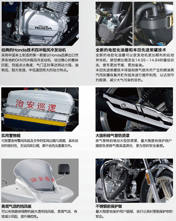 實實在在值得信賴WY125-P治安車,搭載經典的Honda技術四沖程發(fā)動機車型。采用中國本土制造的第一款能以Honda品牌出口世界各地的OHV四沖程風冷發(fā)動機,經過精心的整體匹配,包括點火角度,氣門正時等到達動力強、油耗低、耐久性強、中低速扭矩大的動力特點。