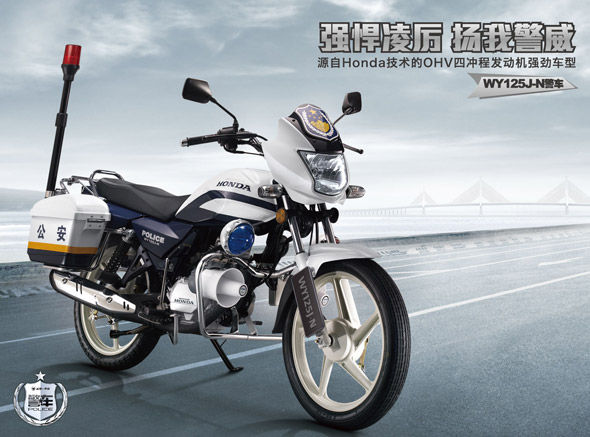 強悍凌厲揚我警威,源自Honda技術(shù)的OHV四沖程發(fā)動機強勁車型WY125J-N警車。