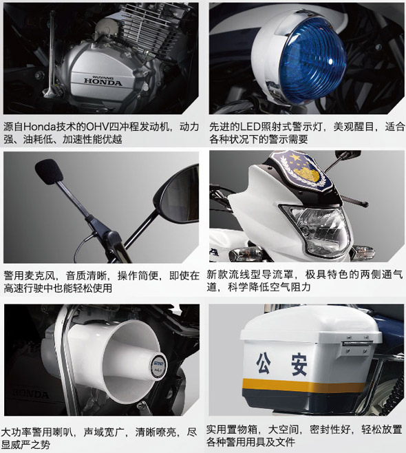 源自Honda技術(shù)的OHV四沖程發(fā)動機,動力強、油耗低、加速性能優(yōu)越。先進的LED照射式警示燈,美觀醒目,適合各種狀況下的警示需要。警用麥克風(fēng),音質(zhì)清晰、操作簡便,即使在高速行駛中也能輕松使用。