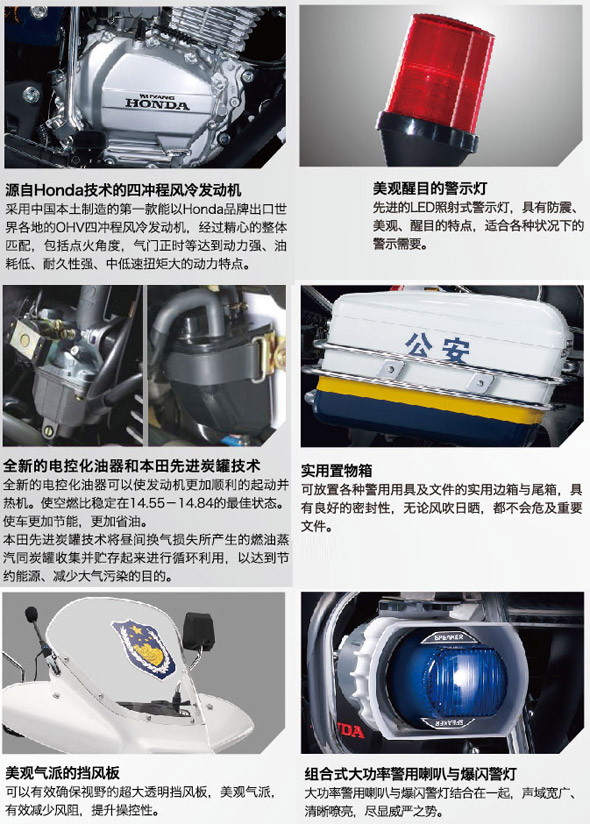 經(jīng)典動力倍添信賴WY125J-P警車,源自Honda技術(shù)的OHV四沖程發(fā)動機車型,采用中國本土制造的第一款能以Honda品牌出口世界各地的OHV四沖程風(fēng)冷發(fā)動機,經(jīng)過精心的整體匹配,包括點火角度,氣門正時等到達(dá)動力強、油耗低、耐久性強、中低速扭矩大的動力特點。