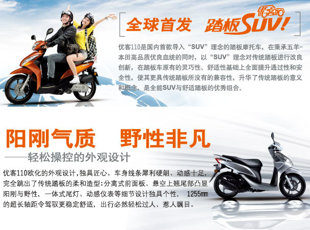 全球首發(fā)踏板SUV,優(yōu)客110是國內(nèi)首款導(dǎo)入“SUV”理念的踏板摩托車。在秉承五羊-本田高品質(zhì)優(yōu)良血統(tǒng)的同時,以“SUV”理念對傳統(tǒng)踏板進行改良創(chuàng)新,在踏板車原有的靈巧性、舒適性基礎(chǔ)上全面提升通過性和安全性,使其更具傳統(tǒng)踏板所沒有的兼容性,升華了傳統(tǒng)踏板的意義和概念,是全能SUV與舒適踏板的優(yōu)秀組合。(價格在10700左右)