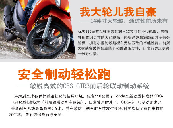 安全制動輕松跑,敏銳高效的CBS-GTR3前后輪聯(lián)動制動系統(tǒng)??紤]到全球各種的道路狀況與使用環(huán)境,優(yōu)客110配置了Honda全新歐盟標(biāo)準(zhǔn)的CBS-GTR3制動技術(shù)(前后輪聯(lián)動剎車系統(tǒng)),日常使用時速下,CBS-GTR3制動距離比普通剎車系統(tǒng)最高縮短近9米,并有效防止剎車時車體發(fā)生側(cè)滑,科學(xué)降低了意外事故的發(fā)生率,更有效保障行駛安全。