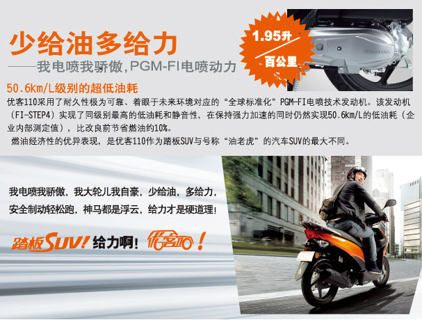 少給油多給力,我電噴我驕傲,PGM-FI電噴動力。50.6km/L級別的超低油耗,優(yōu)客110采用了耐久性極為可靠,著眼于未來環(huán)境對應(yīng)的“全球標(biāo)準(zhǔn)化”PGM-FI電噴技術(shù)發(fā)動機,該發(fā)動機(FI-STEP4)實現(xiàn)了同級別最高的低油耗和靜音性,在保持強力加速的同時仍然實現(xiàn)50.6km/L的低油耗(企業(yè)內(nèi)部測定值),比改良前節(jié)省燃油約10%。燃油經(jīng)濟性的優(yōu)異表現(xiàn),是優(yōu)客110作為踏板SUV與號稱“油老虎”的汽車SUV的最大不同。