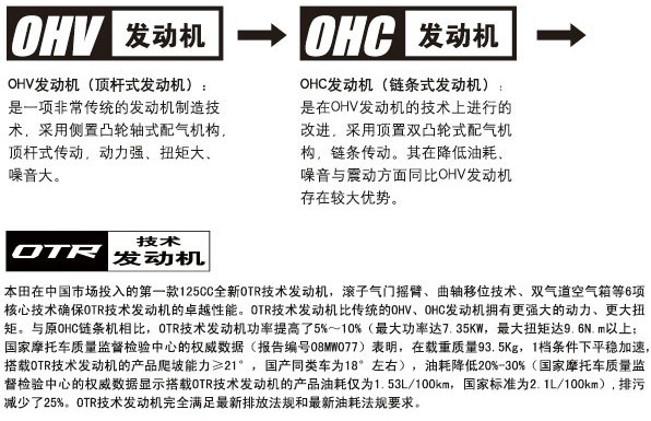 OTR發(fā)動機(jī):本田在中國市場投入的第一款125cc全新OTR發(fā)動機(jī),滾子氣門搖臂、曲軸移位技術(shù)、雙氣道空氣箱等6大核心技術(shù)確保OTR技術(shù)發(fā)動機(jī)的卓越性能。OTR技術(shù)發(fā)動機(jī)比傳統(tǒng)的OHV、OHC發(fā)動機(jī)擁有更強(qiáng)大的動力、更強(qiáng)大的扭矩。與原OHC鏈條機(jī)相比,OTR技術(shù)發(fā)動機(jī)功率提高了5%-10%(最大功率達(dá)7.35KW,最大扭矩達(dá)9.6N.m以上;國家摩托車質(zhì)量監(jiān)督檢驗中心的權(quán)威數(shù)據(jù)(報告編號08MW077)表明,在載重質(zhì)量93.5Kg,1檔條件下平穩(wěn)加速,搭載OTR技術(shù)發(fā)動機(jī)的產(chǎn)品爬坡能力≥12°,國產(chǎn)同類車為18°左右),油耗降低20%-30%(國家摩托車質(zhì)量監(jiān)督檢驗中心的權(quán)威數(shù)據(jù)顯示搭載OTR技術(shù)發(fā)動機(jī)的產(chǎn)品油耗僅為1.53L/100km,國家標(biāo)準(zhǔn)為2.1L/100km),排污減少了25%。OTR技術(shù)發(fā)動機(jī)完全滿足最新排放法規(guī)和最新油耗法規(guī)要求