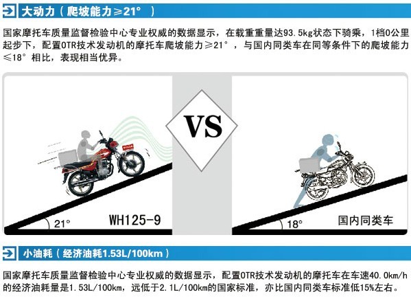 大動力(爬坡能力≥21°)國家摩托車質(zhì)量監(jiān)督檢驗中心的權(quán)威數(shù)據(jù)顯示,在載重重量達(dá)93.5Kg狀態(tài)下騎乘,1檔0公里其部下,配置OTR技術(shù)發(fā)動機(jī)的摩托車爬坡能力≥21°,與國內(nèi)同類車在同等條件下的爬坡能力≤18°相比,表現(xiàn)相當(dāng)優(yōu)異。